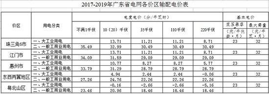 廣東省發 改委日前公布了廣東省各價區輸配電價的通知,通知中對除深圳市外(包括廣東電網公司和廣州供電局營業區域,不含深圳供電局營業區域)各價區2017年-2019年的具體輸配電價進行了公布。詳情如下: