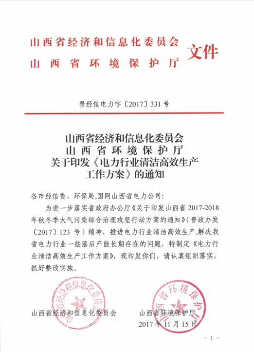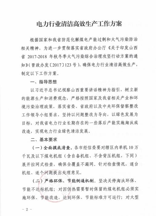 ??為進(jìn)一步落實(shí)省政府辦公廳《關(guān)于印發(fā)山西省2017-2018年秋冬季大氣污染綜合治理攻堅(jiān)行動(dòng)方案的通知》(晉政辦發(fā)〔2017〕123號(hào))精神,推進(jìn)電力行業(yè)清潔高效生產(chǎn),解決我省電力行業(yè)一些落后產(chǎn)能長期存在的問題,特制定《電力行業(yè)清潔高效生產(chǎn)工作方案》,現(xiàn)印發(fā)你們,請認(rèn)真組織落實(shí),抓好整改實(shí)施。