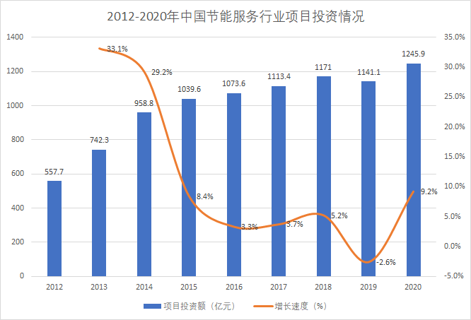 近年來,中國節能服務能效項目穩健開展,2020年,節能服務行業項目投資額約為1245.9億元,同比上漲9.2%。