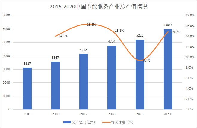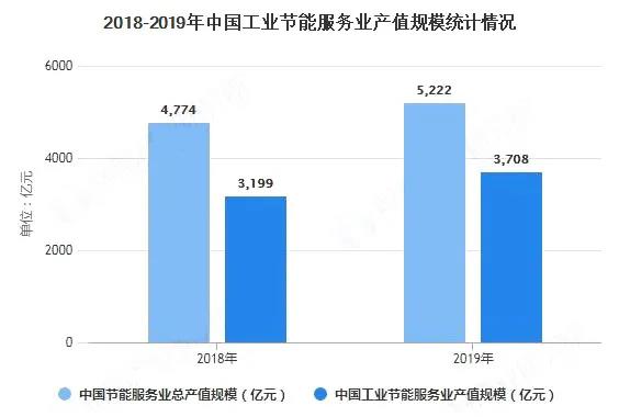 近年來,節能服務產業總產值不斷增長,呈逐年上漲趨勢。中國節能協會數據顯示,2019年我國節能服務產業總產值達5222億元,同比增長9.38%。根據《“十三五”節能環保產業發展規劃》,到2020年節能服務業總產值達到6000億元。我國節能服務行業潛力巨大。