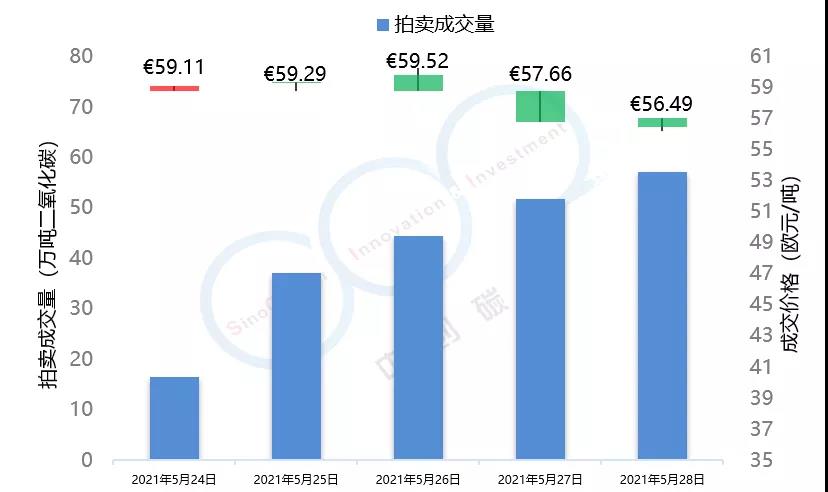 2021年5月24日至5月28日,由于全球能源市場表現(xiàn)較為疲軟,市場投資者對于配額需求的預(yù)期不景氣,歐盟碳市場在本周總體呈現(xiàn)下跌趨勢,在本周三漲至53.59歐元/噸的頂峰后,隨即下跌近5個(gè)點(diǎn),最終收于50.95歐元/噸,回落至接近本月初水平。英國碳市場自上周三開市后,在本周迎來交易的第一個(gè)整周,在短期試探了59.52歐元/噸的碳價(jià)后,英國碳價(jià)逐步回落至56.49歐元/噸,該趨勢與歐盟碳市場基本保持一致。本周歐盟碳市場期貨成交量達(dá)到1.84億噸,配額拍賣量為平均每天300萬噸左右。英國碳市場本周拍賣成交量達(dá)到207萬噸。據(jù)悉,英國政府正在考慮增加2021年英國碳市場配額的拍賣供應(yīng)。