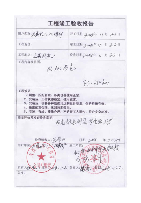 經過嚴格的測試和同期的用電對比,節能效率達到23%,投資回報期一年,節能效率和投資回報期都超過了煤礦領導的預期。八八煤礦由此得到客觀的經濟效益和社會效益。